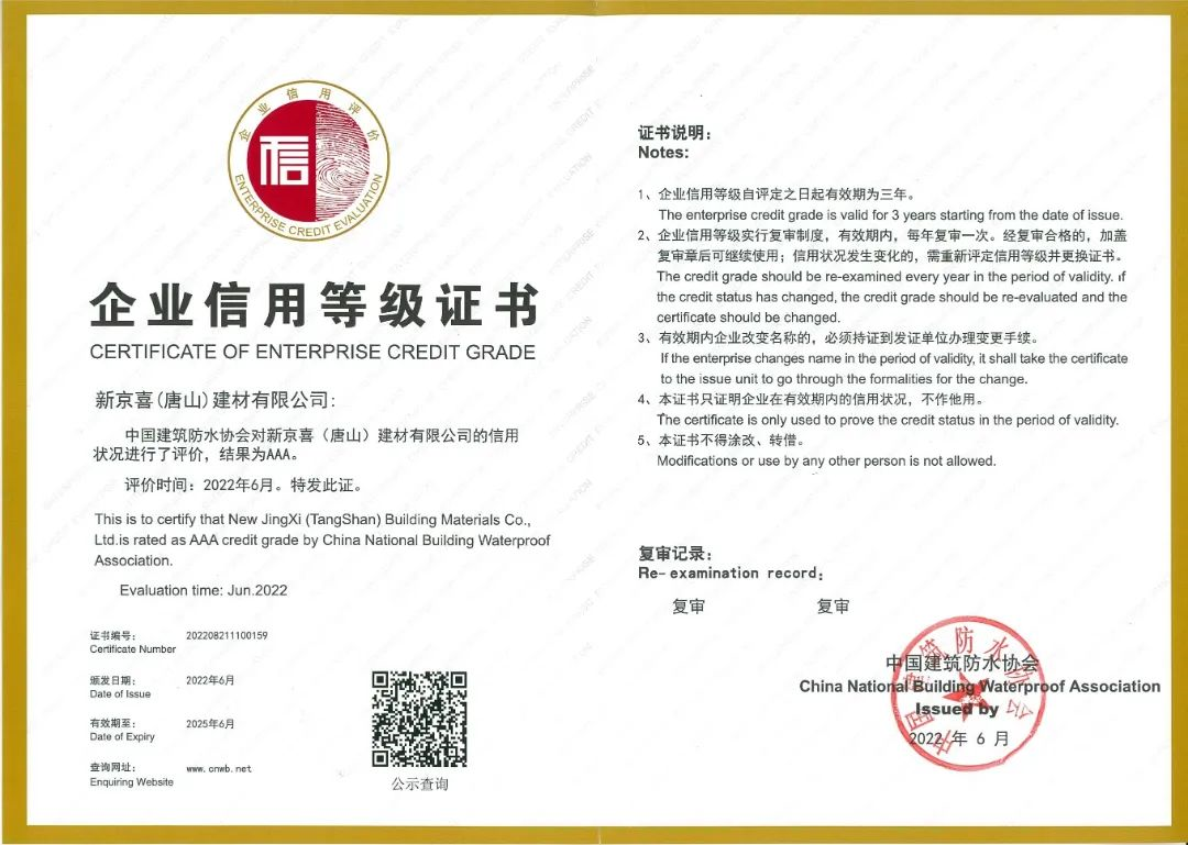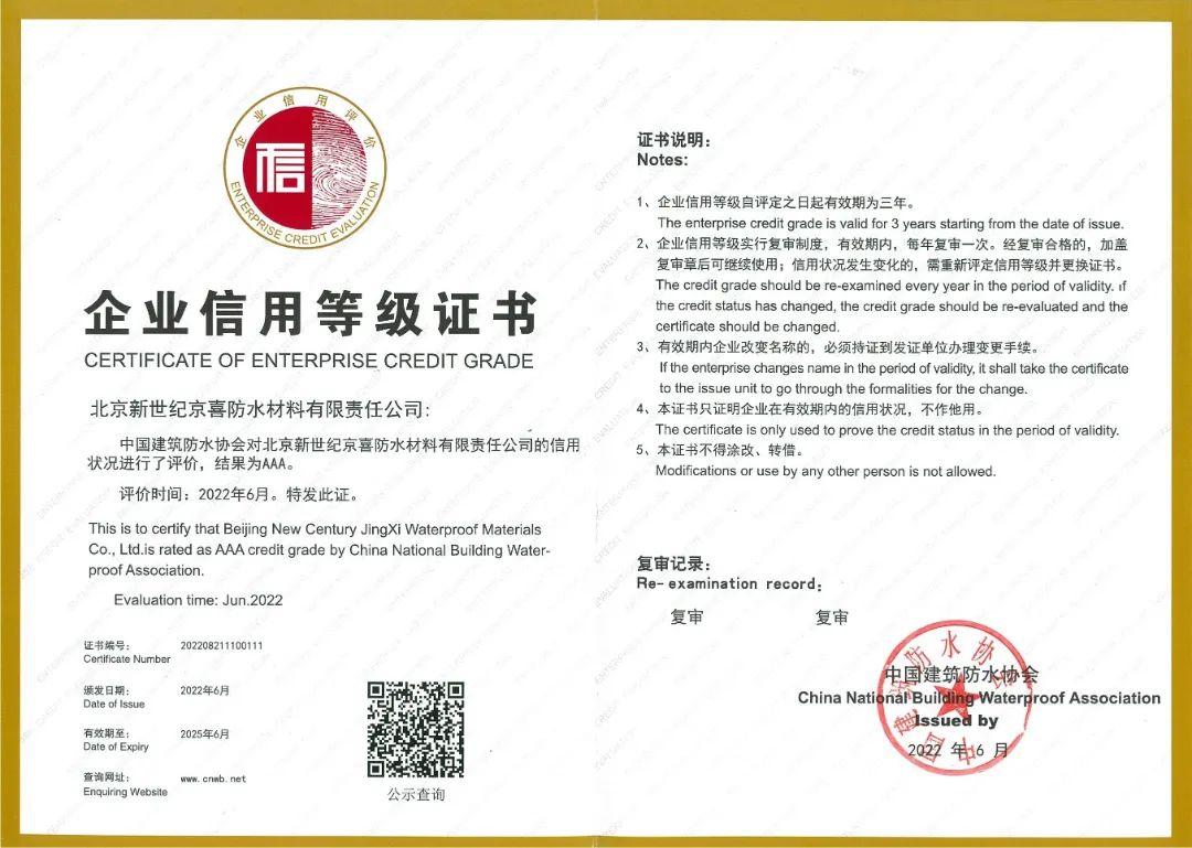 京喜防水在大會中獲得由協會頒發的AAA級企業信用評價證書。