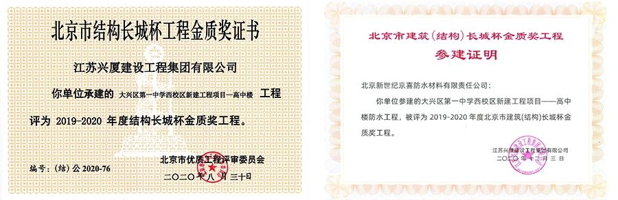 近日,京喜防水參建的北京市(shì)大興區第一(yī)中學西(xī)校(xiào)區新(xīn)建工程項目榮膺北京市(shì)建築結構長城杯。其中,榮獲金(jīn)質獎1項、銀質獎2項。