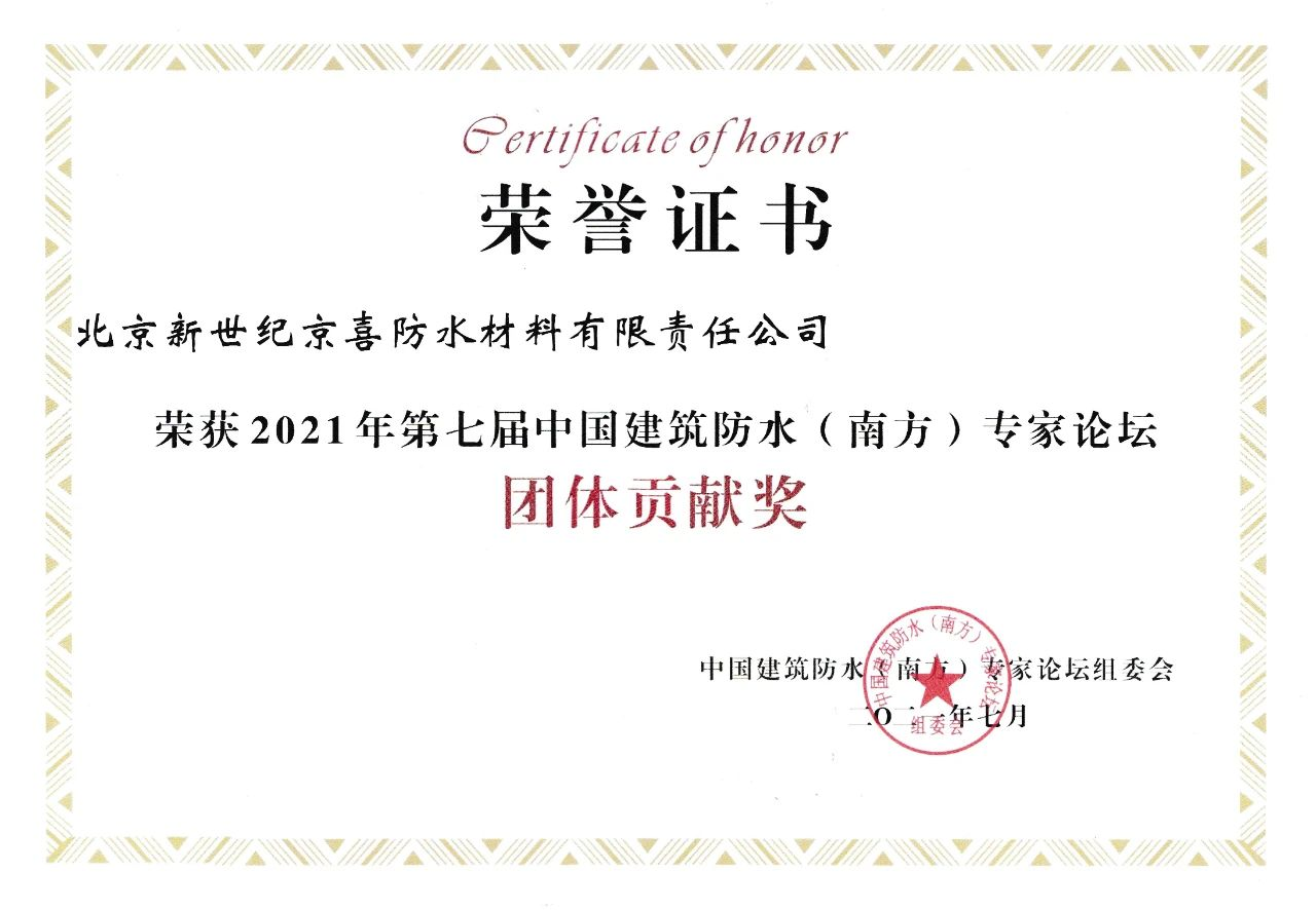 2021年7月(yuè)(yuè)17日,京喜防水榮獲由組委會頒發的“2021年第七屆中國建築防水(南(nán)方)專家論壇-團體(tǐ)貢獻獎”。