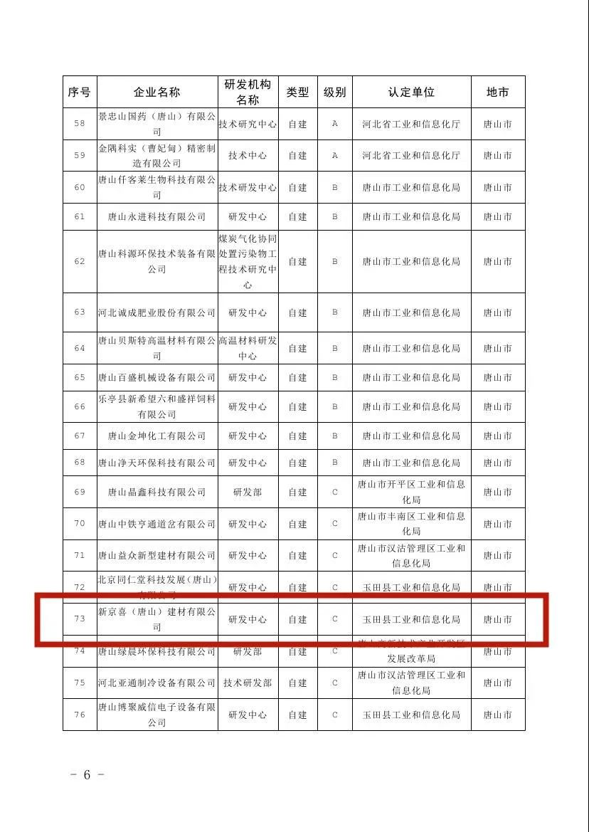 近日,河(hé)北省工業和信息化(huà)廳公布252家符合《河(hé)北省工業企業研發機構認定管理(lǐ)辦法》要求的企業研發機構。其中協會會員(yuán)單位新(xīn)京喜(唐山)建材有限公司(研發中心)位列名單中,具體(tǐ)内容如(rú)下(xià):