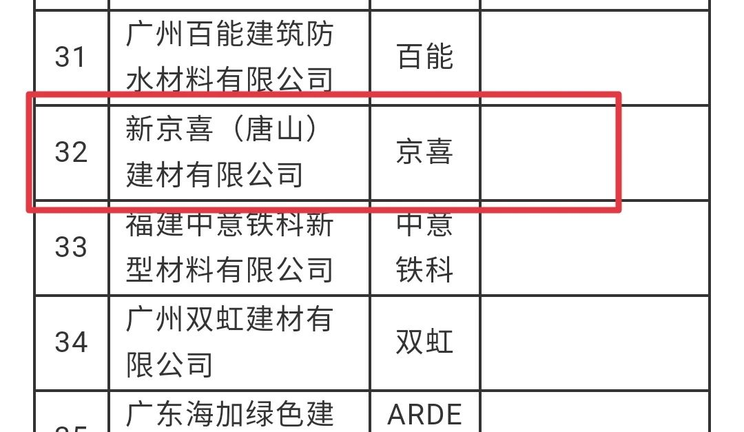 其中,防水材料共有43家入庫,新(xīn)京喜(唐山)建材有限公司位列名單中。