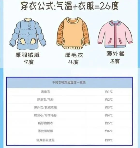 最近很火(huǒ)的 “26℃穿衣法則”相信大家都有聽(tīng)說(shuō):氣溫+衣服增加的溫度= 26℃。